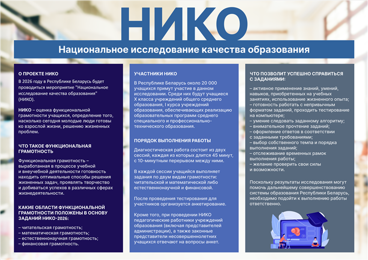 НИКО– это оценка функциональной грамотности обучающихся, в рамках которой определяется, насколько сегодняшние юноши и девушки готовы к взрослой жизни, решению реальных жизненных проблем с использованием тех знаний, умений, которые они получили в учреждениях образования.